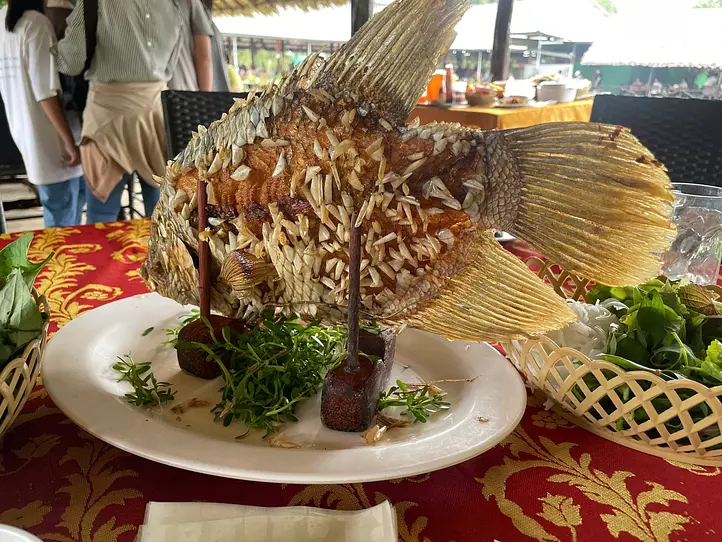 メコンデルタでは新鮮な魚や川エビを使った郷土料理を楽しむことができます。特に「エレファントイヤーフィッシュ(ゾウの耳魚)」や「ココナッツミルクライス」は一度試してみる価値があります。