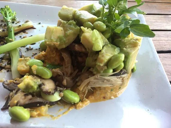 料理は、アボカド、ブロッコリー、エダマメ、マッシュルームとパンプキンのフムスをあわせたもので、いろどりもよく、健康的で、朝にぴったりだと思いました。量はそんなに多くないので、追加でパンを注文してもいいと思います。