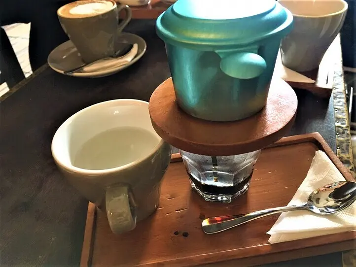 こちらは、定番のベトナムコーヒー練乳入り(3万5,000VND・約175円)。お店のテーマカラーである青緑色のフィンが素敵です。こちらのフィンは購入もできますので、気に入ったらぜひお土産にしてください。