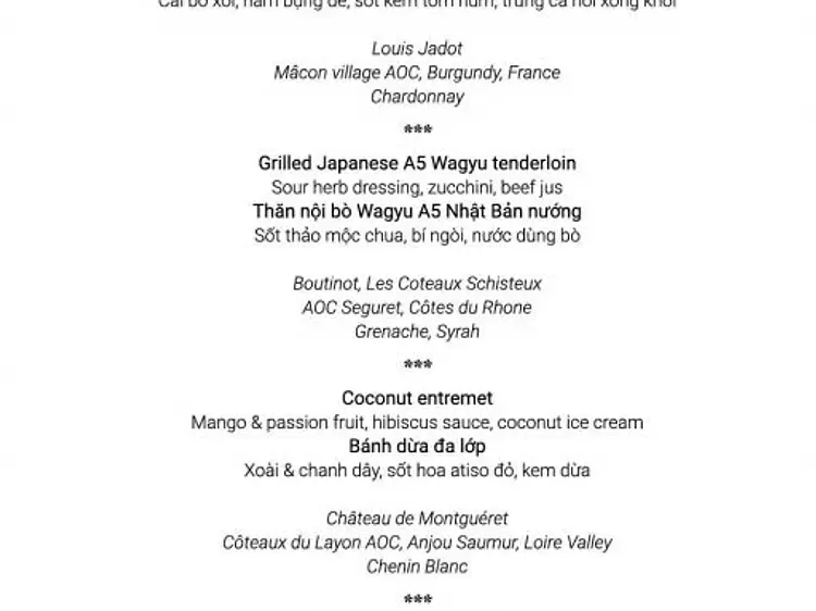 セットメニュー 6 - コースSet Menu 6 - Courses 18,300円\ '001-1v-2a1 1 0 011-1h2a1 1 0 011 1v2a1 1 0 001 1h2a1 1 0 001-1v-6.586l.293.293a1 1 0 '\ '001.414-1.414l-7-7z'ホーム›レストラン›フランス料理›リュンヌ・レストラン&バー›セットメニュー 6 - コース概要ギャラリー詳細ご予約予約するギャラリーアイテムの概要料金18,300 円(3,000,000 VND)アイテム内容の説明✲ この料金にはワインとカクテルは含まれていません。ワインペアリング: 1,250,000 VNDカクテルペアリング: 1,100,000 VNDキャンセルポリシーSHAREおすすめコメントを投稿するおすすめ度すごくおすすめ!おすすめいいと思う時間があればおすすめしない料金また利用したい期待以上だった満足したあまり満足しない不満があったロケーションまた利用したい期待以上だった満足したあまり満足しない不満があったサービスまた利用したい期待以上だった満足したあまり満足しない不満があったバリューまた利用したい期待以上だった満足したあまり満足しない不満があった 画像おすすめコメントを投稿するご予約18,300 円(3,000,000 VND)\ d='M13 16h-1v-4h-1m1-4h.01M21 12a9 9 0 11-18 0 9 9 0 0118 0z'以下の情報を入力して、送信ボタンを押してください。予約内容がメール送信され、予約完了後、お客様のメールアドレスに予約完了のお知らせが送信されます。店舗リュンヌ・レストラン&バー商品(コース)セットメニュー 6 - コース料金(1名あたり)18,300 円3,000,000 VNDお客様情報お名前*パスポートに記載の氏名(ローマ字)メール*電話番号*人数予約日時翌日分のご予約は日本時間15時まで承っております。予約日時候補1×その他メッセージ 時間指定など、その他要望があれば記入ください。