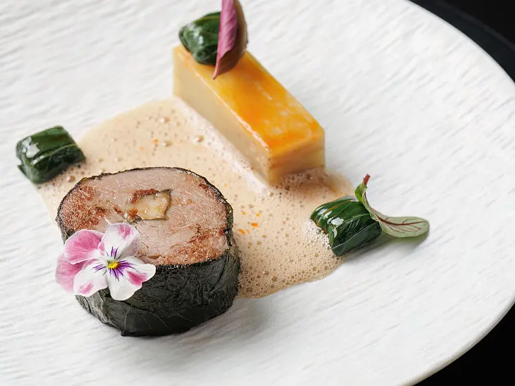 仔牛のフィレ肉に12ヶ月熟成コンテチーズと紫蘇の葉を詰め、さらに「ブランジェール」風のポテト、チンゲンサイ、ビールとベーコンのエマルション、サテオイルを添えた一品です。価格は1,000,000 VNDです。