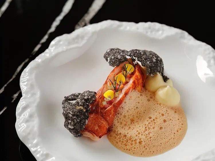 Canadian lobster tail, Green curry lobster sauce, mashed potato, crunchy vegetables