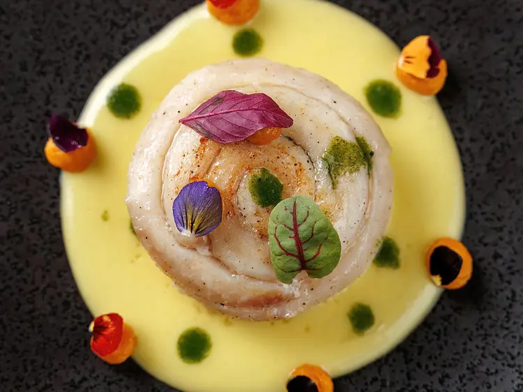 上質な河豚のフィレを使用し、香り高いラクサの葉で仕上げた一皿です。