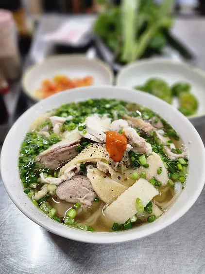 フォー・フオン・ビンは、1958年以来、誇りを持ってベトナムの国民的な米麺スープ料理、フォーを提供しているシンプルな屋台です。メニューにはフォーガー(鶏の麺スープ)とフォーボー(牛の麺スープ)の2つのアイテムしかありません。鶏の皮、卵黄、牛ブリスケット、テンドンなどの追加のトッピングを自由に注文してください。スープは透明で軽く、豊かな風味とうまみの甘みがあります。