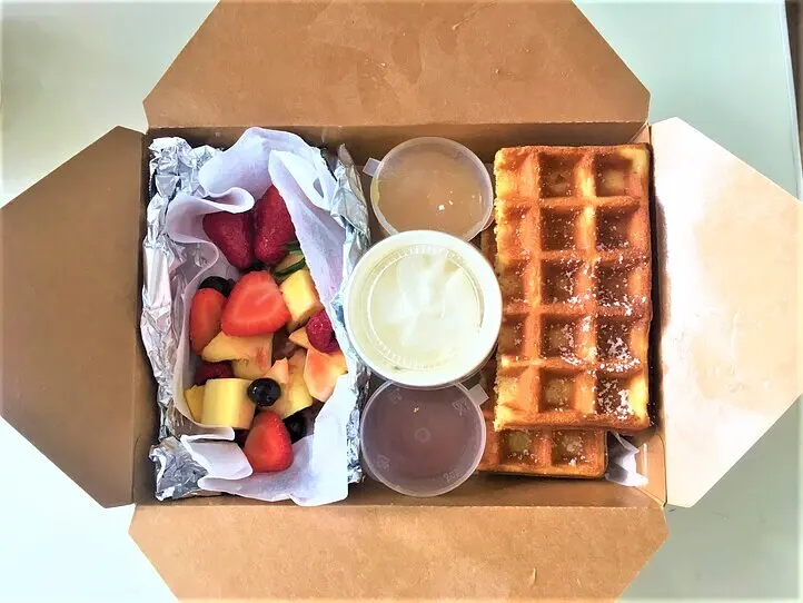 さくさくの大判ワッフル2枚に、ホイップクリーム、メープルシロップ、パッションフルーツジャム、そして果物(パイン、マンゴー、ブルーベリー、いちご)がセットになっています。