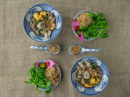 観光に欠かすことのできない、ベンタイン市場から徒歩5分。市場からレライ通りをまっすぐ行くと、黄色い提灯のかかった3階建てのお店が「ブンダウ・ホームメイド」。二人の女性オーナーはハノイ出身、本場ハノイの味をお届けします。接客にあたるスタッフもハノイの伝統衣装を纏い、店内は北部の時間が流れます。ここでは、ハノイの伝統料理「ブンダウ」と呼ばれる料理を食べることができます。ブンダウとは、一口サイズに固めたブンをマントムと呼ばれるタレにつける食べ物。ブンと一緒に食べる惣菜は、豚肉や緑豆の餡を揚げたさつま揚げ、揚げ豆腐に香草など。料理のやさしい味はもちろん、ドリンクを注文しても500円ほどでお腹いっぱいになることもまた魅力です。店内にはたくさんの水上人形劇で使う木彫りの人形が飾られ、壁にはベトナムの昔の風景画が描かれ、どこか懐かしさを感じさせてくれます。光が差し込む店内は常夏の植物が多く、女性らしい繊細さを感じさせる空間です。オーナーは水上人形劇に魅了された一人で、師匠に弟子入りした経験から得た、本場北部発祥の水上人形劇を店内で鑑賞することができます。
