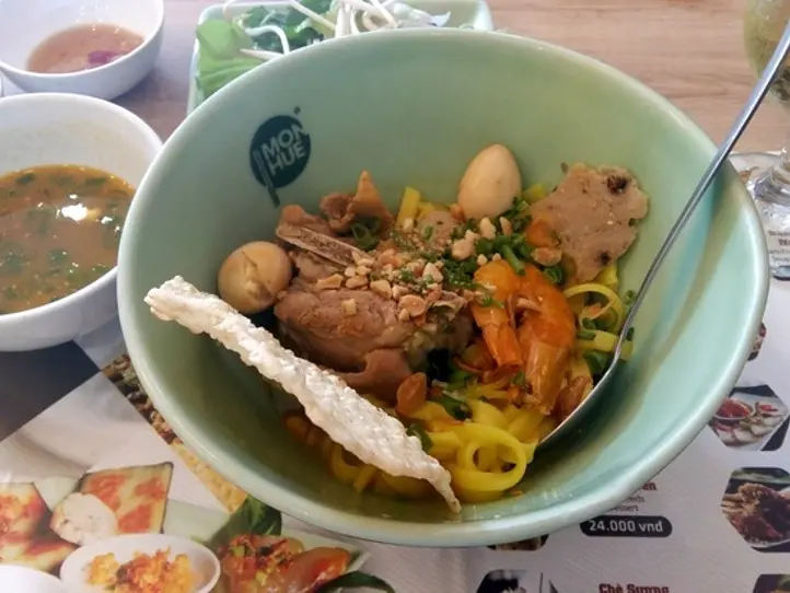 こちらは中部ダナン発祥の麺料理。先ほどのブンとは違い、黄色く平たい麺です。麺の上にエビやうずら、豚の骨付き肉がのっていて、葉っぱとライムをいっぱいのせて食べます。