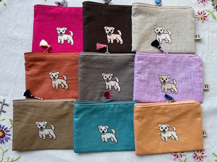思わず笑顔がこぼれる、愛らしいワンちゃんの表情に癒されませんか? 一つひとつ丁寧に手刺繍を施した、世界にたった一つの温もりあふれるミニポーチです。