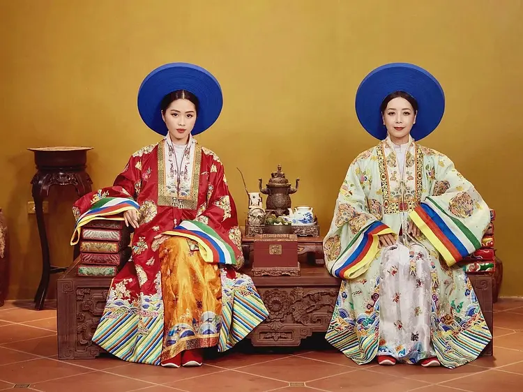 「Nhật Bình(ニャットビン)」は、ベトナムの伝統的な宮廷衣装のひとつで、特に阮(グエン)朝時代の皇后や高貴な女性たちが着用していた正装です。