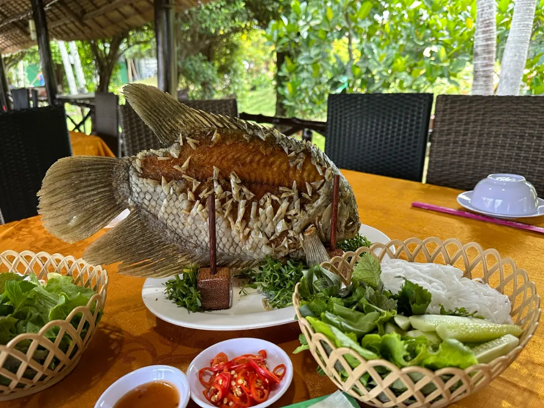 昼食は「Mekong Rest Stop」というレストランにて、ベトナムの名物料理をお召し上がりいただきます。突き出した鼻が象のように見えることから名付けられた名物の「エレファントイヤーフィッシュ」や、春巻きやバインセオといったベトナムを代表するメニューを中心にお召し上がりいただけます。