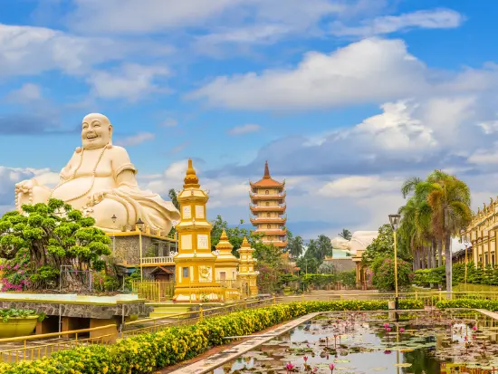 永長寺(ヴィンチャン寺)は、19世紀に建てられフランス・ローマ、タイなどアジアとヨーロッパの建築が融合した建築様式です。高さ1.2メートル・重さ150kgの寝仏像は大迫力です。貴重な60体以上の仏像と大きな仏像3体だけでなく、坊さんの養成学校や庭園などもあります。フランスと中国の影響を受けたベトナムの永長寺(ヴィンチャン寺)をお楽しみ下さい
