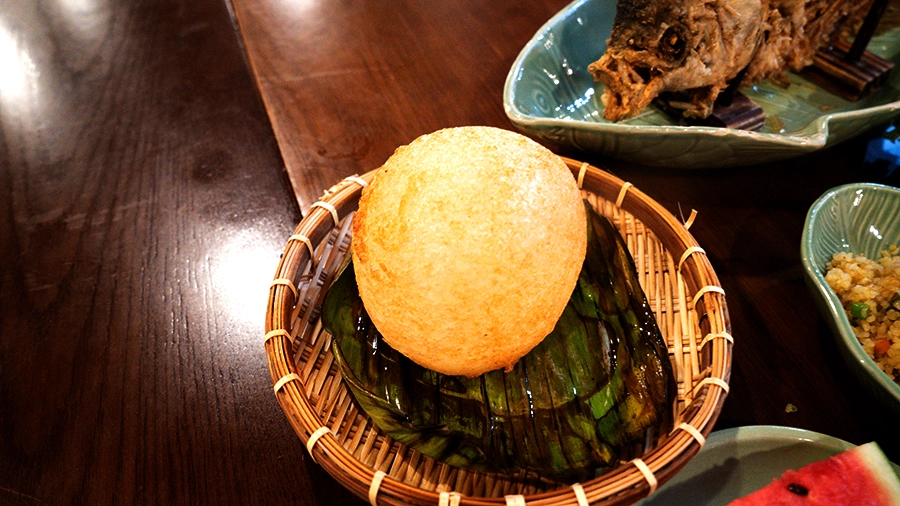 揚げると丸くボールのように膨らんで、中は大きな空洞となる。 メコン川地域でしか食べられない名物です。